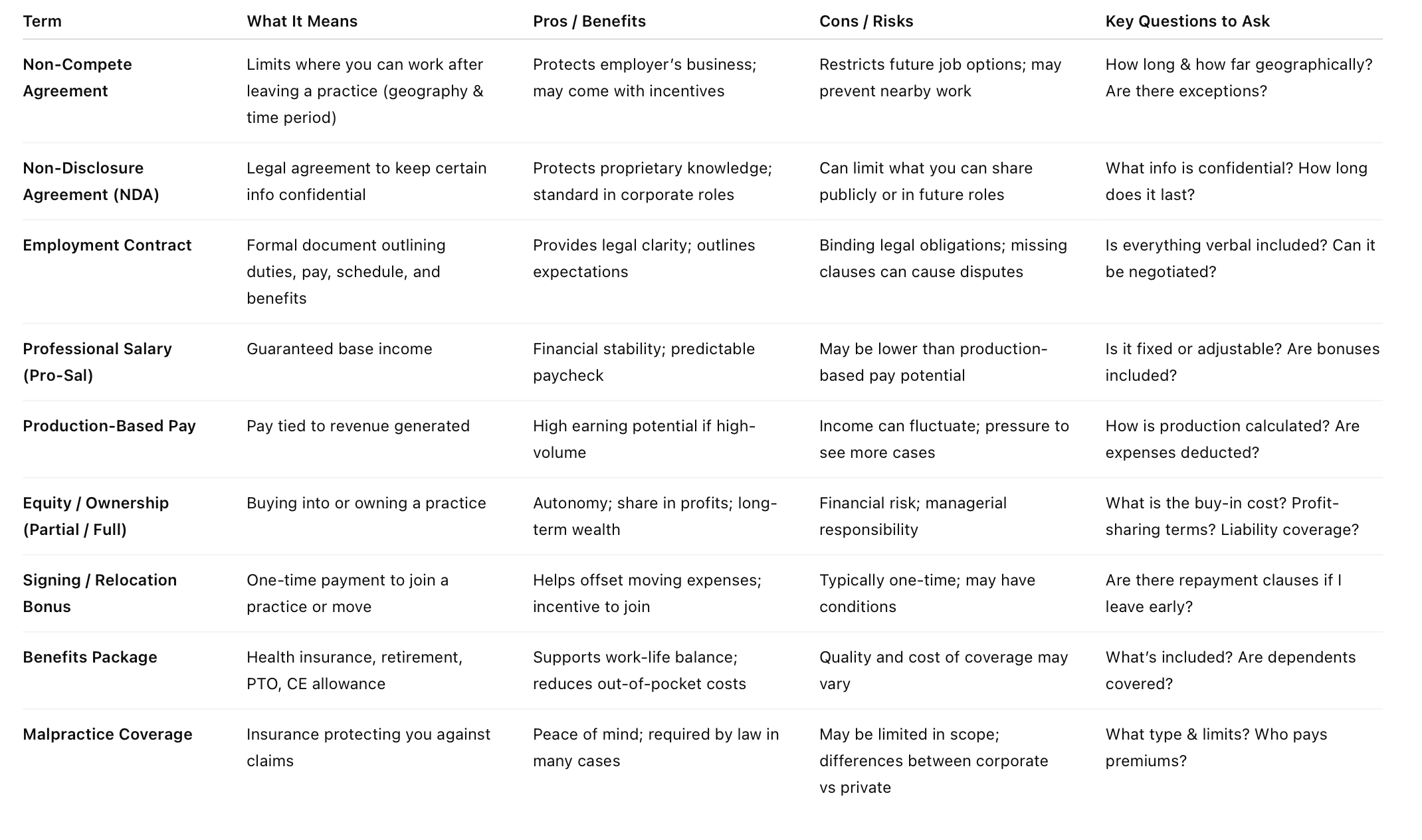 Other terms commonly encountered in contracts include signing or relocation bonuses, which can help offset moving expenses or incentivize joining a practice. Benefits packages often cover health insurance, retirement contributions, paid time off, and continuing education allowances. Malpractice coverage is another critical consideration, particularly if you’re moving between corporate and private practice settings, as coverage requirements and protections may differ.