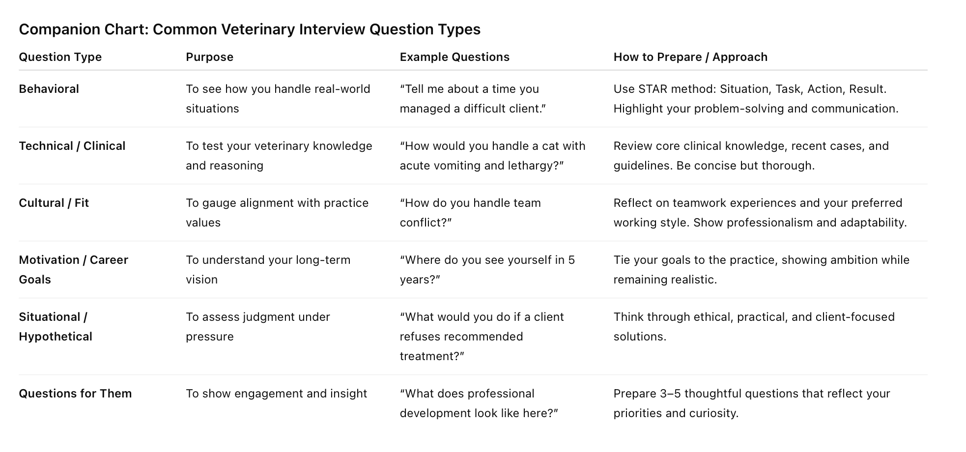 Your presence during the interview is just as important as the content of your answers. Confidence, professionalism, and approachability all matter. Eye contact, a genuine smile, and clear communication convey that you are someone who can be trusted with patients, clients, and colleagues. Sharing your story—whether it’s about why you chose veterinary medicine, your experiences in shelter work, emergency care, or specialty practice—makes you memorable and demonstrates your passion for the field. By illustrating not just what you can do, but how and why you do it, you give interviewers a clear sense of your fit for the role.