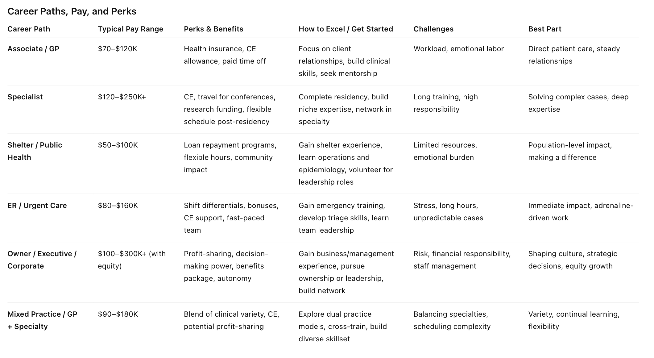 Veterinary medicine offers a spectrum of professional experiences, each with unique rewards and challenges. Early-career associates focus on building expertise, while specialists and mixed-practice veterinarians balance depth and variety. Shelter medicine and public health emphasize population-level impact, whereas emergency medicine tests speed and composure under pressure. Private and corporate practice shape the professional environment, and ownership or executive roles define long-term influence and responsibility.