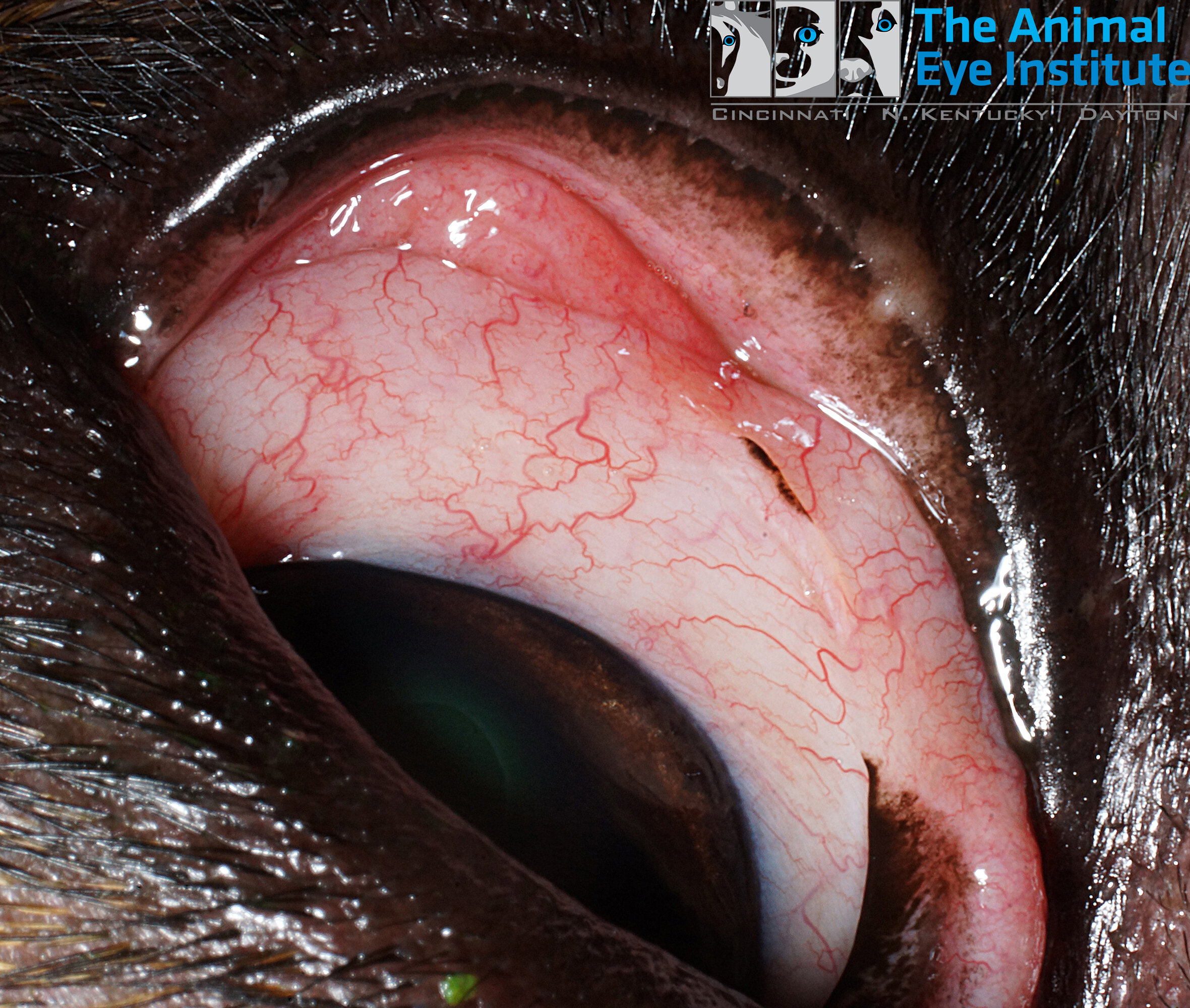 Euryblepharon (aka Macropalpebral Fissure) is a congenital condition where the eyelid fissure is larger than normal and causes increased scleral exposure. This condition is commonly seen in both large breed dogs and small brachycephalic dogs. Euryblepharon is commonly associated with lagophthalmos, pigmentary keratitis (brachycephalic dogs), and entropion/ectropion (large breed dogs). In canines, the length of the eyelid fissure when stretched should measure approximately 33 mm. For the diagnosis of euryblepharon, the fissure will measure 5 to 15 mm longer. Referral to a veterinary ophthalmologist is recommended for evaluation and surgical correction, which might involve a medial and/or lateral canthoplasty, keeping in mind that other more extensive blepharoplasty procedures might be indicated depending on the severity of the condition. Eye lubrication with HA-containing ophthalmic ointments can be helpful in the management of severe cases, or cases where lagophthalmos is present, until the condition is able to be surgically corrected.